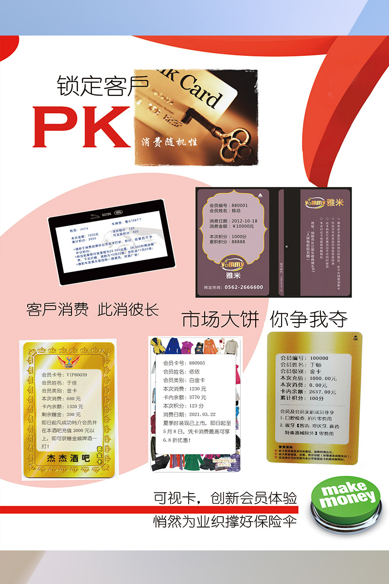 抓住客人注意力: 打印最新数据于卡面上,信息肉眼可见:打印记最近一次消费购物的金额、储值余额、总积分等资料
