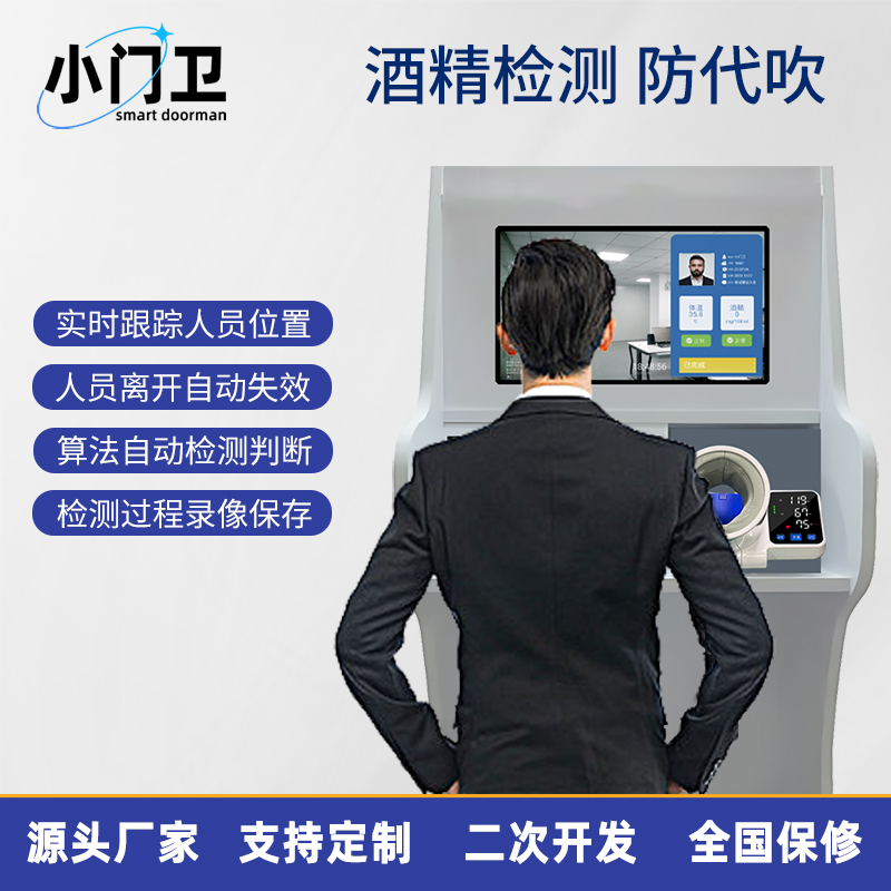 血压血氧心率测温检测小门卫岗前终端一体机可检测舒张压、收缩压、心率、血氧等健康指标,还能通过多点阵、非接触式红外传感器进行体温检测,体温超标时设备自动报警。具备酒精检测功能,采用 16mm 电化学燃料电池传感器,量程范围为 0mg/100mL-400mg/100mL,测量分辨率达 1mg/100mL。采用双目活体检测技术,配备 200W 宽动态双摄防伪,杜绝照片及视频代验证,确保检测结果真实。同时支持人脸识别、IC/ID 刷卡、二维码扫码、证件核验、指纹比对等多种身份核验方式。具备数据存储、上传云端等功能,可实时保存检测结果和考勤记录,方便查看追溯。同时支持消息通知功能,告警信息可通过电脑弹窗、手机微信消息、短信消息、邮件消息等方式及时通知相关人员。
