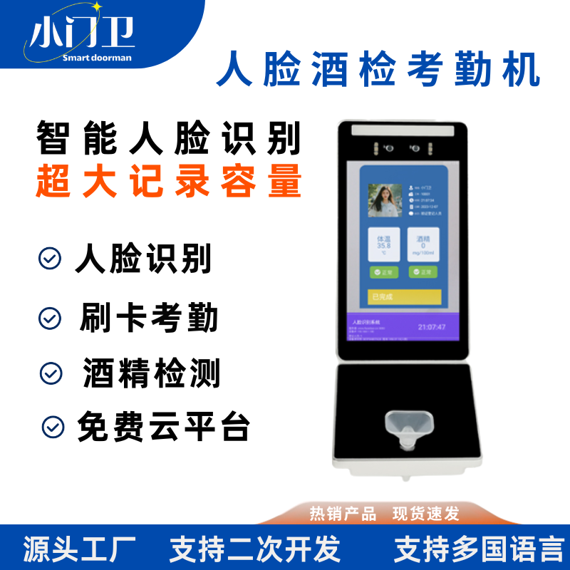 酒精检测机源头工厂可二次开发考勤打卡机设备采用电化学酒精传感器,检测快速、数值准确,支持数据实时上传、存储、导出,全程可追溯。搭载高性能人脸识别模块,识别速度快、通过率高,支持口罩、暗光、动态场景下稳定核验。支持 SDK/API 二次开发,可对接企业现有管理系统、平台、闸机、门禁及云平台,灵活定制功能与界面。整机稳定耐用、安装简便,提供标准化接口与技术支持,适合工程商、系统集成商、政企项目批量采购。源头厂家,品质可控,支持贴牌与项目定制,是安全管理、智能考勤、岗前风控一体化解决方案的理想选择。