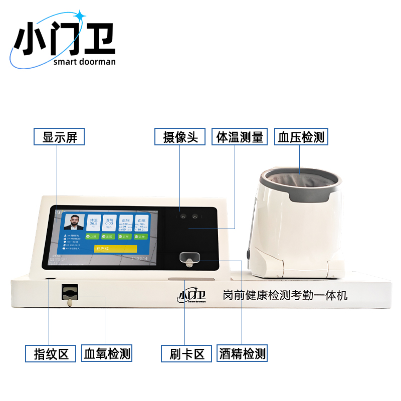 小门卫血压血氧岗前上班签到考勤门禁一体机是岗前健康与考勤门禁一体化智能终端,集血压血氧检测 + 岗前签到考勤 + 门禁通行 + 健康筛查于一体,30 秒内完成身份核验、血压血氧采集、考勤签到与门禁放行全流程,适配矿区、高铁、工厂等对岗前健康要求严格的行业场景,为企业筑牢岗前安全防线。支持血压(含收缩压 / 舒张压 / 脉率)、血氧饱和度检测,采用降压示波法 + 柯式音法,血压误差 ±3mmHg、脉率误差 ±5%;搭配非接触红外测温(精度 ±0.3℃),异常指标自动声光报警,数据实时上传云平台。同一平台管理,支持多排班、报表自动生成,开门记录与健康数据云端存储可追溯;检测合格自动开门,超标锁定门禁,杜绝带病上岗。
