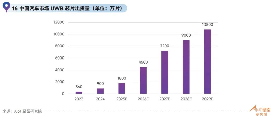 基于以上汽车渗透度的预测,结合多锚点方案的情况,AIoT星图研究院预计中国汽车市场UWB芯片出货量在2026年将达4500万片,2029年可达1.08亿片。