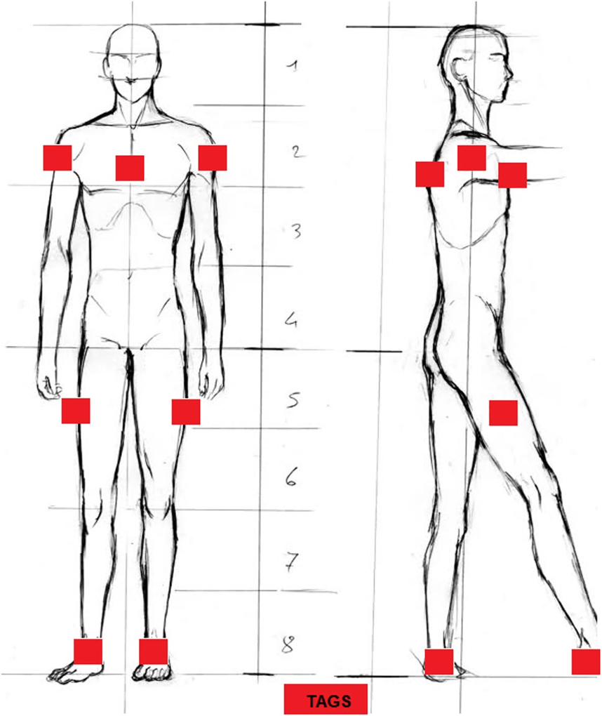 标签放置在身体的一些固定点,最大限度减少行走时的移动干扰,并确保其他身体部位不会意外覆盖它们。上身放置在肩膀、背部和胸部;身体中部放置在大腿上部;对于下身,放置在脚踝。