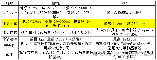 RFID 的 HF 频段子集,仅工作于 13.56MHz,通信距离≤10cm(典型≤4cm),集成读卡器、卡模拟、点对点三种模式,主打双向安全交互,向下兼容 ISO/IEC 14443 等 RFID 标准。