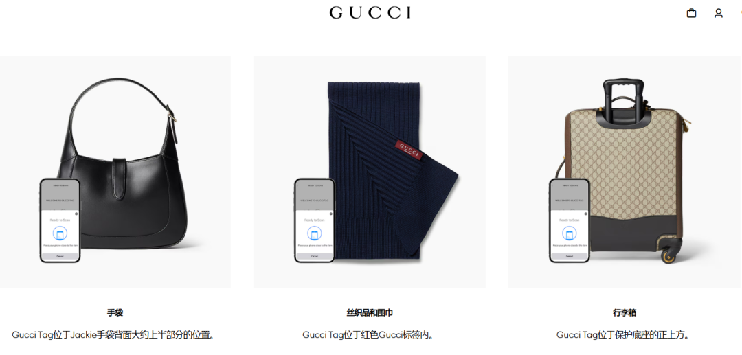 Gucci Tag在指定商品上提供,通过预配置的NFC技术提供支持,只需将智能手机放在商品附近,即可查看商品的相关信息。