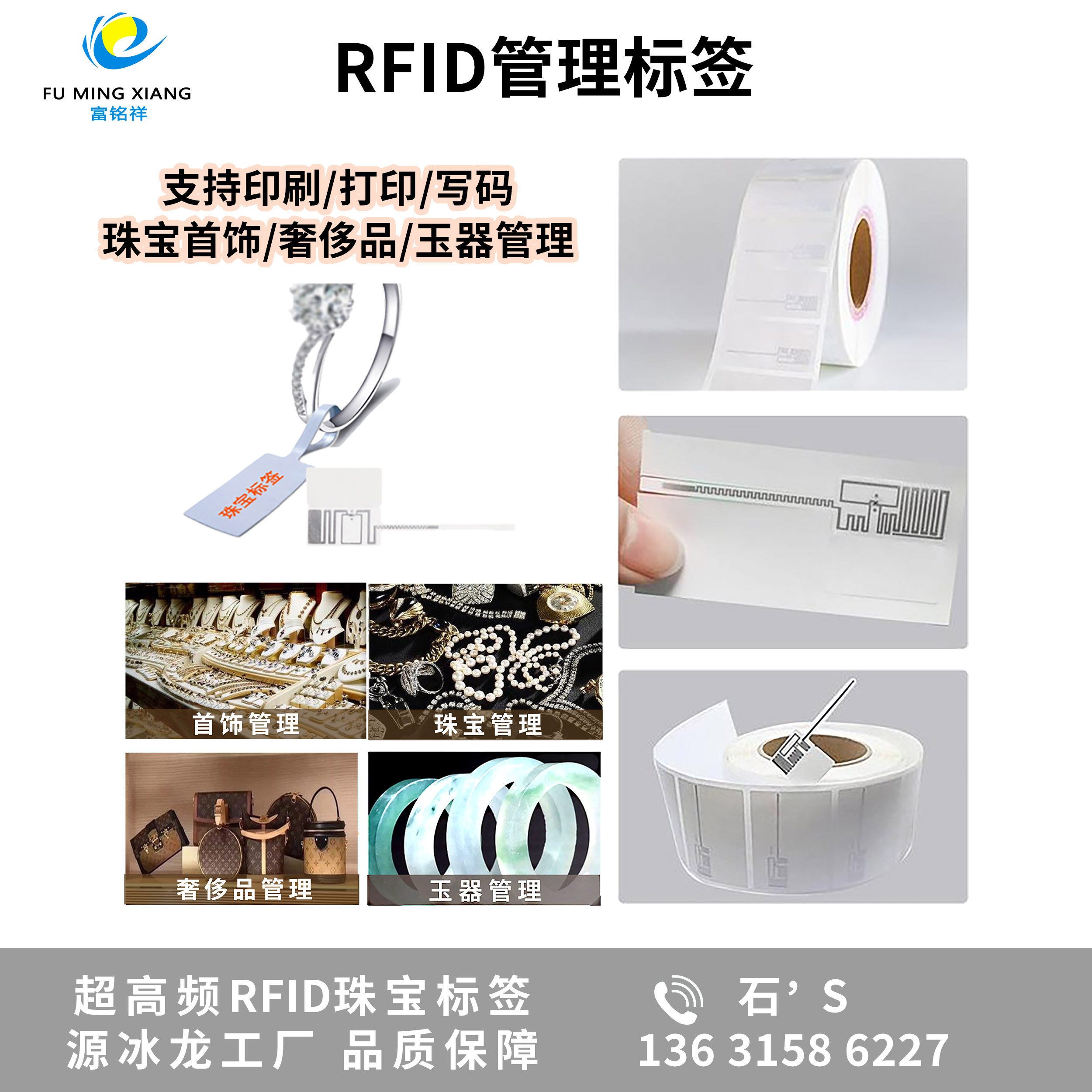 RFID电子标签使用PET材质封装而成,具有柔韧性,防水等特性,目前广泛应用于珠宝管理、奢侈品管理,文物管理,化妆品管理,药品管理,眼镜管理、玉器管理等。