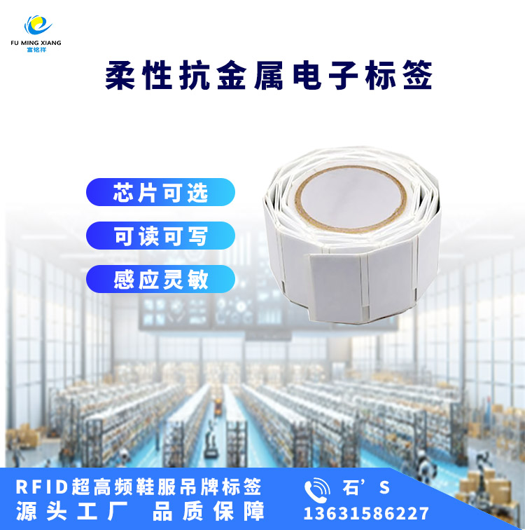 柔性抗金属标签使用PET材质封装而成,具有柔韧性,防水等特性,目前广泛应用于资产管理、设备管理、物流仓储管理