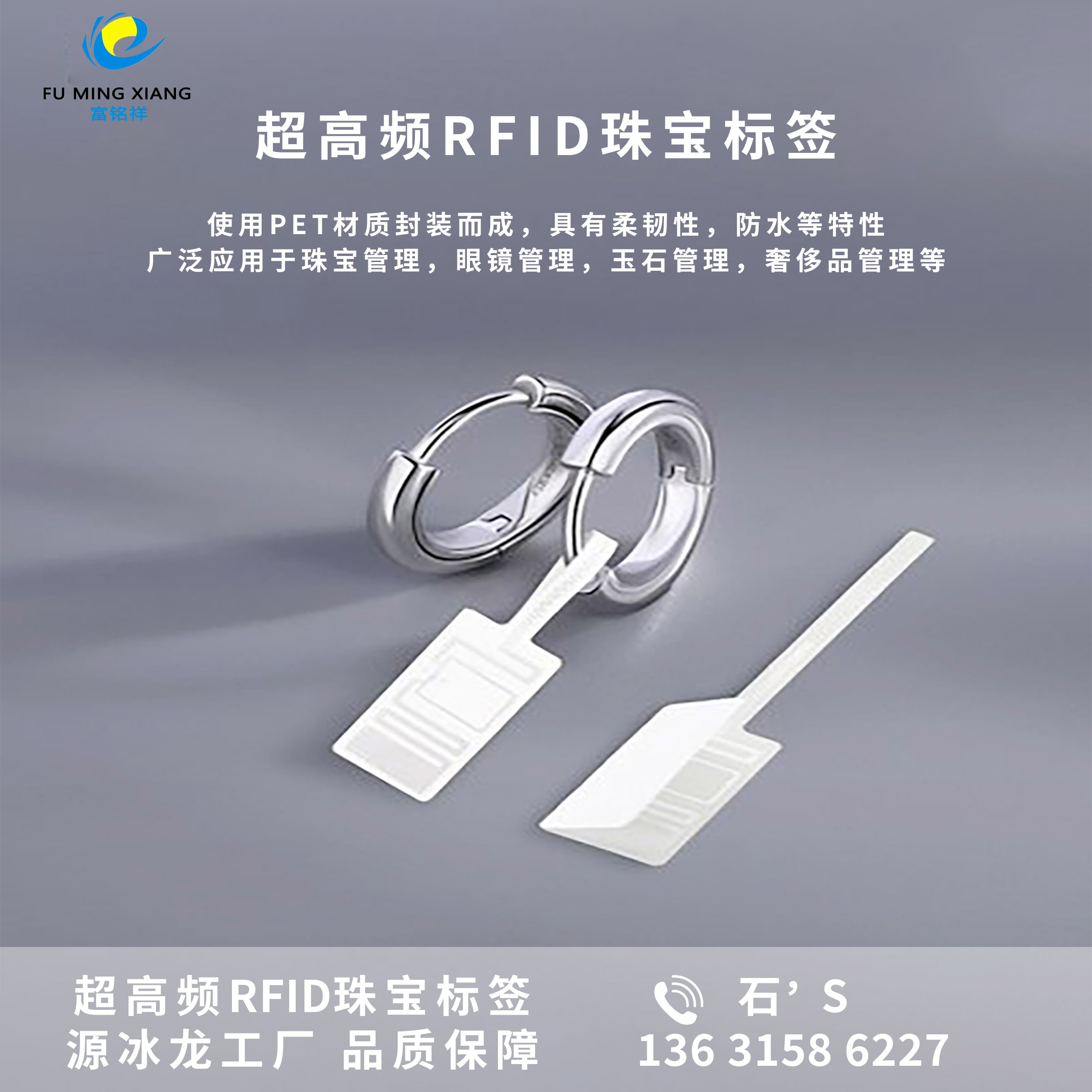 RFID电子标签使用PET材质封装而成,具有柔韧性,防水等特性,目前广泛应用于珠宝管理、奢侈品管理,文物管理,化妆品管理,药品管理,眼镜管理、玉器管理等。