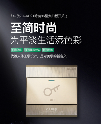 在高端商业场所、豪华酒店及精装修项目中,门禁系统的每一个细节都关乎整体空间的品质感与用户体验。出门开关作为高频使用的交互终端,其外观设计、材质工艺与电气性能同样重要。ZUU中优推出的ZU-KD21香槟金三线出门开关,以轻奢风格金属质感面板、三线制全功能输出、50万次按压寿命及V0级阻燃材质,为五星级酒店、高端写字楼、奢侈品店等场所提供了兼具美学价值与工业可靠性的出入口控制解决方案。