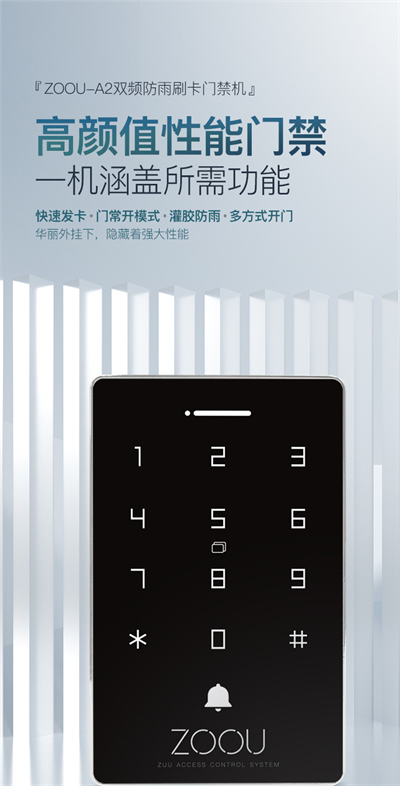 ZOOU-A2双频防雨门禁机的价值,不仅在于其IP65/IP66级防水防尘的硬核参数,更在于通过双频兼容、触摸按键、大容量存储等创新设计,精准解决了户外门禁场景的各类痛点。它将传统的“户外门禁执行终端”升级为“全天候智能感知节点”,为小区、工厂、园区等场所提供了安全、可靠、便捷的出入口控制解决方案。无论是新建项目的高标准要求,还是旧改项目的品质升级,ZOOU-A2都是值得纳入选型清单的专业选择。