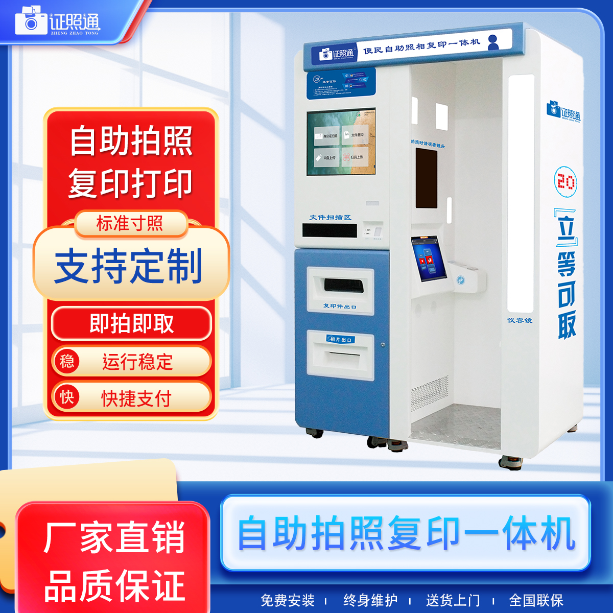 告别传统打印的时空束缚,这款自助一体机集打印、复印、扫描、证件照制作于一体,一台设备搞定多元需求。无需安装驱动、不用注册登录,扫码直连、U 盘插入、云端调取多种上传方式任选,触屏操作直观易懂,新手也能秒上手。