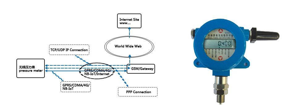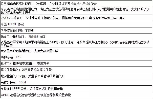 GPRS/CDMA无线压力表是针对市场需求而研发的集成了压力信号采集、数据存储和无线数据通信于一体的高性能监测设备,采用超低功耗技术,使用一次性锂电池供电,现场不需要电源就可以直接实时采集标准变送器信号或仪表输出的数字信号,电平信号、干触点、脉冲信号等,具备上下限自动检测实时报警的功能,是过程信号实施无线监测的最佳方案。