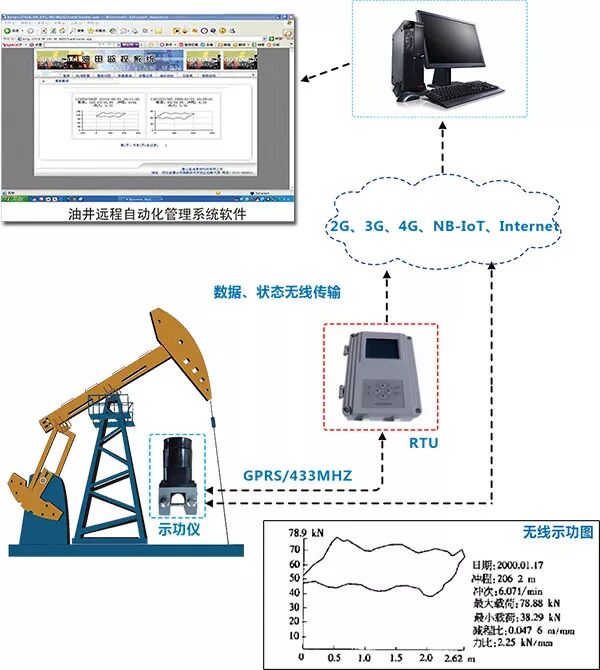 示功仪终端将载荷和位移传感器集成在一起,用加速度传感器测位移,用电池供电,一节电池可以用2年以上。该单元安装在方卡子和悬绳器之间,采集到载荷、位移、冲程、冲次、工作时率等参数后,以无线方式和RTU通信。量程可以选择,最大量程250KN。该设备可以和监控主机一起使用,采集的数据在主机上显示,也可以直接通过GPRS/CDMA/4G/NB-IoT向监控中心发送数据。