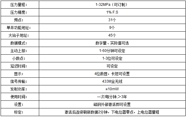 433MHZ无线压力表属于H&J系列油水井无线监控系统的配套产品,适用于石油油水井生产、储运工艺过程的压力监测,由于采用微功耗无线通讯模式,不需要电缆供电,安装更为快捷、安全、方便,另有配套的无线RTU或转接模块,可将诸多无线压力信号转换为MODBUS标准信号通过串行接口传输, 能够适应其它测控系统的嵌入,有着广泛的应用层面。