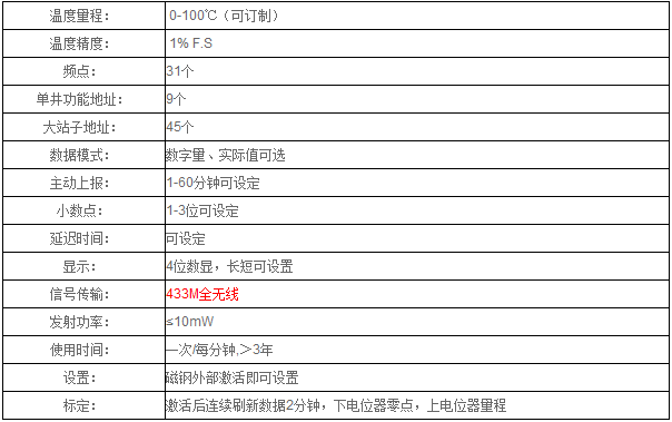 433MHZ无线温度计属于H&J系列油水井无线监控系统的配套产品,适用于石油油水井生产、储运工艺过程的温度监测,由于采用微功耗无线通讯模式,不需要电缆供电,安装更为快捷、安全、方便,另有配套的无线RTU或转接模块,可将诸多无线压力信号转换为MODBUS标准信号通过串行接口传输,能够适应 其它测控系统的嵌入,有着广泛的应用层面。