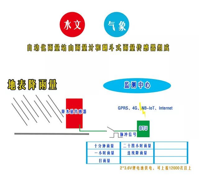 雨量计和翻斗式雨量传感器组成,在降雨测量过程中,雨量传感器随着翻斗间歇翻倒动作,带动开关,发出一个个脉冲信号,将非电量转换成电量输出给雨量计。雨量计自动计量出十分钟雨量、一小时雨量、日雨量、二十四小时雨量、连续降雨量,然后通过无线通信网络发送到监测中心 | |||